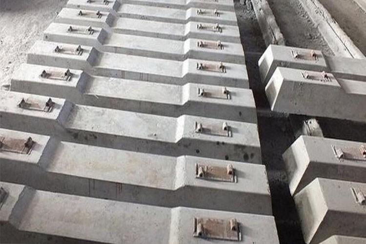 2、軌距水泥枕木鋪設(shè)使用時,建議施工前應(yīng)做好防裂措施,一般方法為采用枕木端頭鐵線捆扎或打釘竹釘鈑工藝處理,枕木在鋪設(shè)施工中,打進(jìn)道釘作業(yè)前,需要采用直徑略小于道釘直徑4-6mm的鉆頭,在確定打進(jìn)道釘?shù)奈恢眠M(jìn)行事前鉆孔,鉆孔深度應(yīng)小于打進(jìn)道釘長度20-30mm,防止枕木漲力過大開裂,造成產(chǎn)品持釘力下降或產(chǎn)品報廢,施工作業(yè)應(yīng)避免單根產(chǎn)品超負(fù)荷使用,謹(jǐn)防折斷。